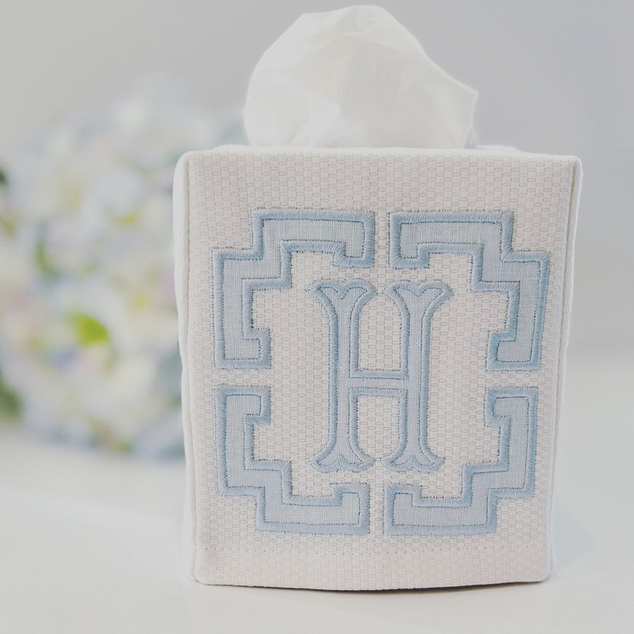 Add a touch of personalized elegance to any room with our monogrammed tissue box cover. Crafted from premium fabrics and expertly tailored to fit effortlessly over a standard square tissue box, turning a household necessity into a stylish accent. Choose from a range of thread colors and appliqué monogram styles and fabrics to create a piece that's uniquely yours — whether classic, modern, or whimsical.