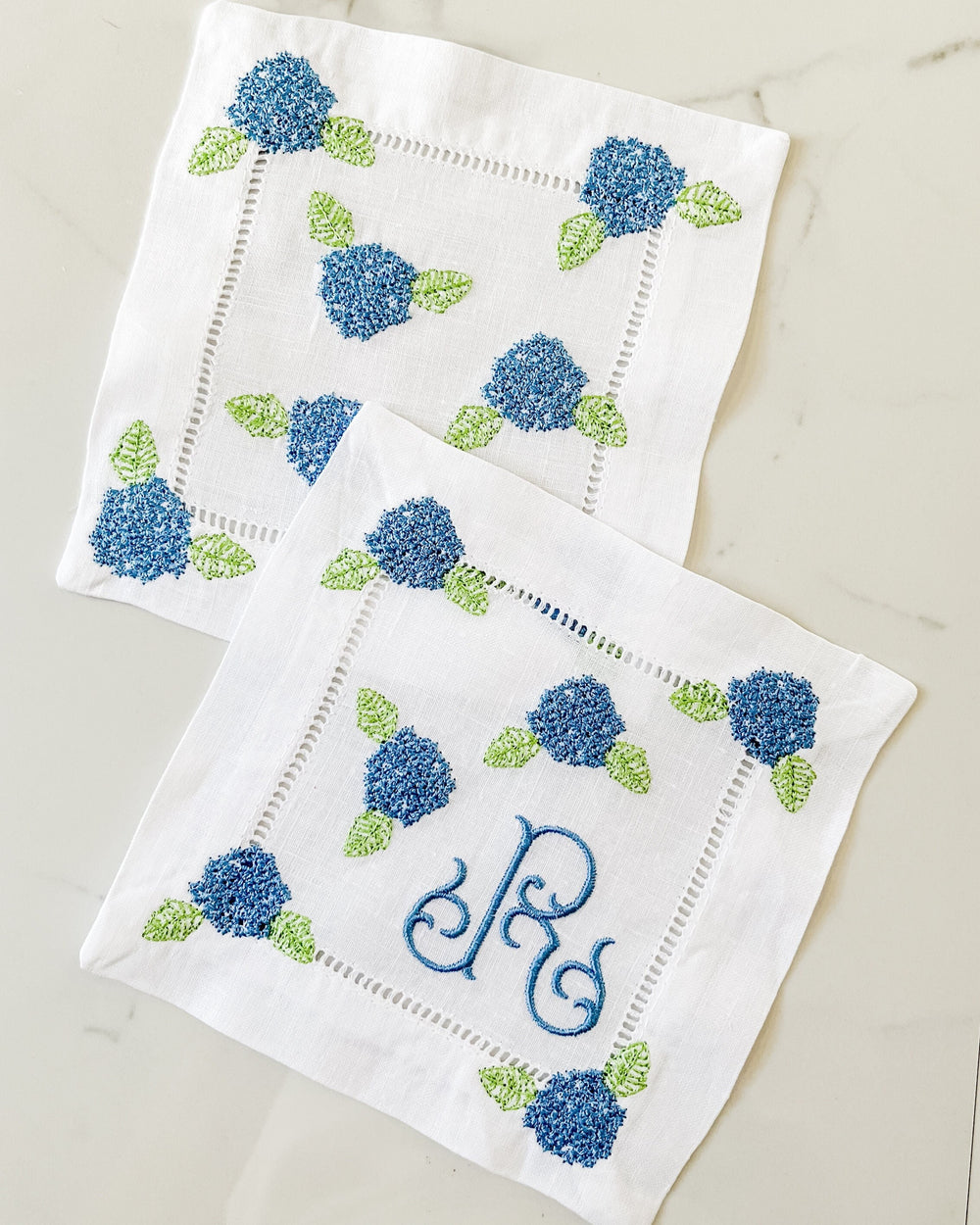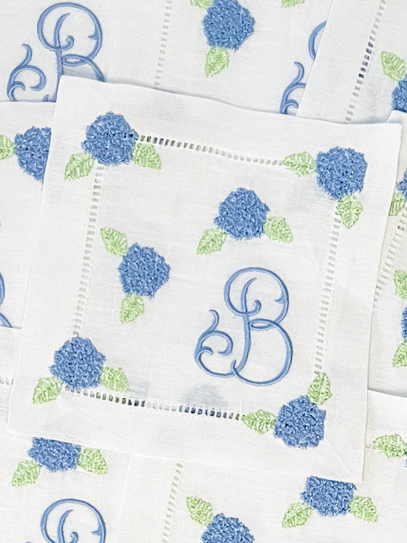 Lovely hydrangea themed embroidered cocktail napkin set. Perfect for gift giving or for your own bar cart. Measures 6x6 and sold as a set of 4.