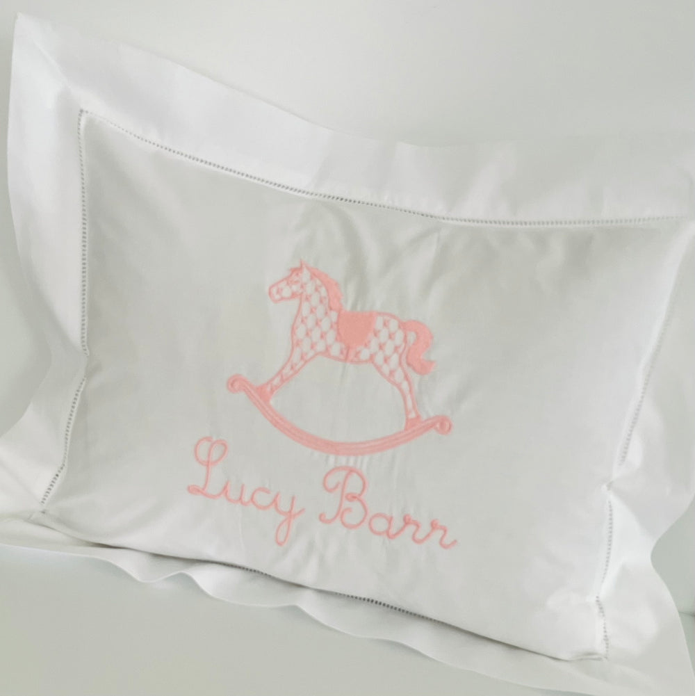 Beautiful baby boudoir pillow sham with a hand embroidered scalloped edge. Sham is 200 thread count cotton and available in white, pink or blue scalloped edging. Back closure is a tie closure. Opening for the pillow insert measures 12x16, total dimensions (edge to edge) 16x20.  PILLOW INSERT NOT INCLUDED